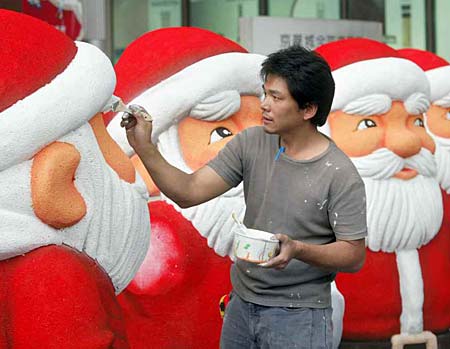 臺北市街頭近來陸續開始妝點圣誕樹及圣誕老人等相關應景物品,一家百貨業者在戶外廣場樹立可愛的圣誕老公公模型,工作人員正仔細為保麗龍制的作品上色,為漸冷的街頭點綴些許喜慶與溫馨。(據臺灣《中國時報》報道)