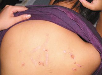 潘姓少女遭同學在背上刮皮刻字凌虐。