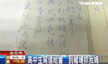 中國臺灣網4月2日消息 據臺灣TVBS報道,臺北市一名高中男同學,受不了母親每晚外出賭博,鼓起勇氣寫信到北投警分局求救,拜托救救他們一家人,還直接寫下母親賭博地點,警方循線果然破獲隱身在民宅內的賭場。
