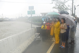 大水淹進(jìn)了丸山路住家,縣長(zhǎng)呂國(guó)華和鄉(xiāng)長(zhǎng)張秋明挨家挨戶敲門勸住戶撤離。軍方出動(dòng)一百五十多名人力,協(xié)助堆砂包,清淤塞。