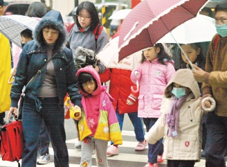 強(qiáng)烈寒流來襲,清晨家長帶著小朋友上學(xué)時,都穿上厚重的冬衣。(圖片來源:臺灣《聯(lián)合晚報》)