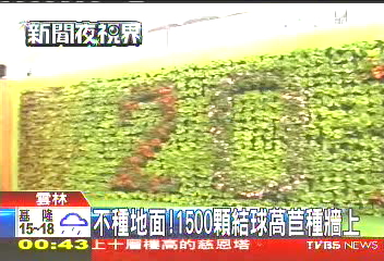 中國臺灣網2月8日消息 據臺灣TVBS電視臺報道,一般人印象中,萵苣都是種在地上,但云林麥寮一位農民,卻把結球萵苣,種在一整面墻上,密密麻麻種了1500顆,隨時可以架梯子摘來吃,還很應景地排出2010形狀,別出心裁的“萵苣墻”,也成了裝飾用的綠意景觀。