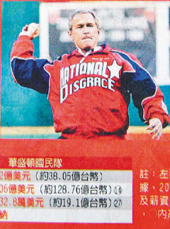 近期的臺灣《自由時報》體育版,放了一張布什幫華盛頓國民隊開球的照片,乍看之下沒什么特別,但仔細看球衣上的字竟是“NATIONAL DISGRACE”,NATIONAL代表著國家,DISGRACE可是代表著恥辱。其實2005年布什幫華盛頓國民隊開幕戰開球的畫面,胸前只有NATIONALS的字樣,因為真正的球衣就印著這幾個字。