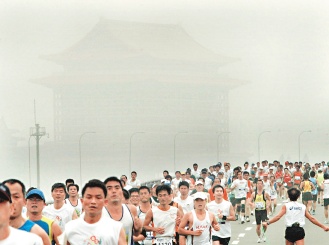 沙塵暴昨日襲臺,參加臺北公路馬拉松賽的選手在灰蒙蒙的空氣中比賽,后面的臺北圓山飯店隱約浮現。圖片來源:臺灣《聯合報》