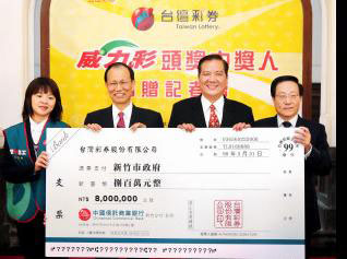 新竹市市長許明財(右二)、臺灣彩券公司董事長薛香川(左二)、臺灣彩券公司總經(jīng)理黃志宜(右一)、臺灣信托慈善基金會副主任李婉如(左一)等人手持威力彩頭獎中獎人捐贈支票合影。圖片來源:臺灣“今日新聞網(wǎng)”