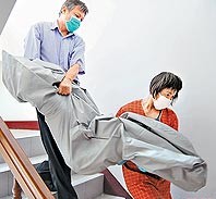 方麗華被殺后,兇嫌用塑料袋包裹藏在家中浴室,尸體由葬儀社人員搬下樓。