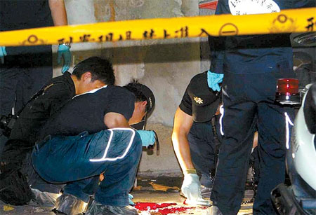 警員莊志強(qiáng)在停車(chē)場(chǎng)開(kāi)槍誤傷派出所長(zhǎng)后自殺,留下大片血跡,鑒識(shí)人員到場(chǎng)采證。來(lái)源:臺(tái)灣《蘋(píng)果日?qǐng)?bào)》