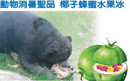 “我們看到南臺灣有很多椰子,想到利用椰子殼制成水果冰,給動物消暑”,突發奇想的動物園管理中心主任張博宇說,椰子殼里裝蜂蜜水及水果,冰凍后就成為可口冰品,動物聞到蜂蜜味道,邊舔邊剝開椰子,吃里面的水果和椰子肉。
