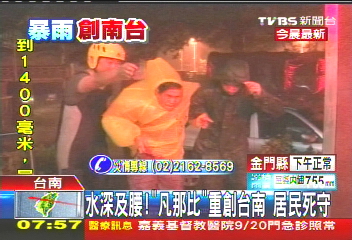 據(jù)報道,臺南縣受災(zāi)較為嚴(yán)重,水深及腰。消防隊只得出動救生小艇,換上蛙人裝深入災(zāi)區(qū)。但臺南縣的一些居民覺得自己住的高,消防隊員好說歹說,也不肯搬家。被撤出的災(zāi)民中,有驚魂未定的一家5口。爸爸拿著值錢的家當(dāng),媽媽抱著強褓中的嬰兒,看著熟睡的孩子擦拭著眼淚。她表示,自己又回想起了“88水災(zāi)”(2009年8月6日至8月10,臺風(fēng)“莫拉克”侵襲臺灣,造成500多人死亡),她的好幾個親人在那次水災(zāi)中死去。