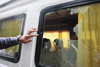 兩名共乘機車的恐怖份子,19日持沖鋒槍在印度新德里知名地標賈瑪清真寺3號門前開槍濫射,TVBS《食尚玩家》乘坐的巴士車窗粉碎。 圖片來源:美聯社