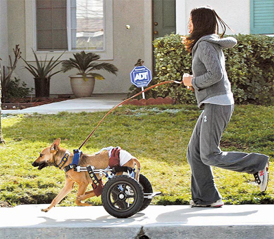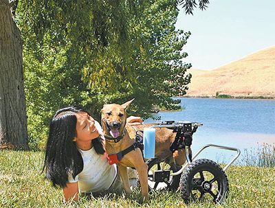 后腿癱瘓的狗狗“卜派”被美國人茱蒂收養,借由輪椅與主人在街頭慢跑。來源:臺灣動物緊急救援小組
