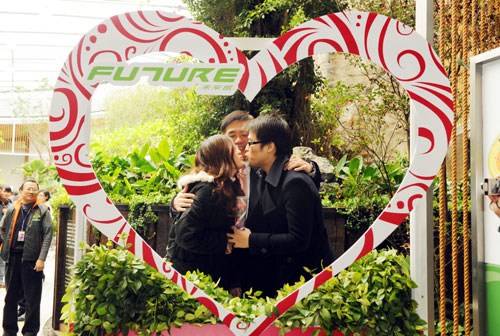 適逢情人節,花博未來館號召百對情侶同游,臺北市長郝龍斌(后中)14日發送花心巧克力,并為情侶們見證甜蜜的一刻。圖片來源:“中央社”