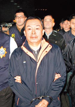 臺當局“刑事局”16日在臺北基隆等地破獲松聯幫老大吳來居(中)等人涉嫌以汽油彈縱火暴力討債集團案。圖片來源:臺灣《中國時報》