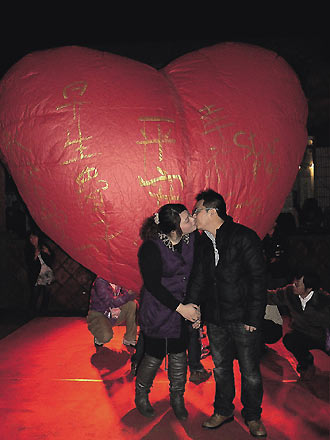 新北市政府14日晚舉辦白色情人節放天燈活動,來自板橋的戴蓓蕾(左)向相戀8年的男友胡育銘(右)求婚成功后,兩人一起施放心型天燈。 來源:臺灣《聯合報》