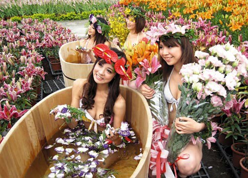 四名模特兒30日拿臺(tái)中后里區(qū)銷日主要花卉,清涼入浴。圖片來(lái)源:臺(tái)灣《聯(lián)合報(bào)》