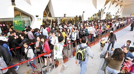 由于是花博展期的最后一個(gè)周末,拜天公作美之賜,許多入園民眾幾乎是全家動(dòng)員、扶老攜幼,舉目所見,不管是在熱門展館或紀(jì)念品銷售處,都是大排長龍,擠得水泄不通。