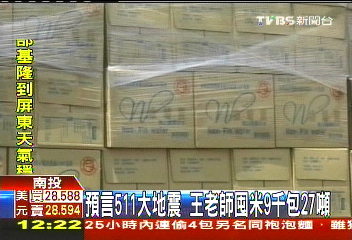 中國臺灣網5月9日消息 據臺灣TVBS新聞臺報道,日前預言5月11日臺灣將有14級大地震,并引發大海嘯的王老師,家當已經搬到臺灣中部南投埔里的貨柜屋。他還請工人運來一卡車的礦泉水,以及9000包總重量達27噸的白米,囤積在貨柜屋內。