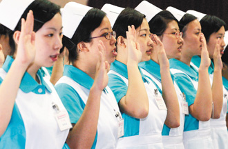 臺灣醫院護士荒,許多人拿到護士、護理師執照后,卻不當護士。圖為一所護校舉行加冠典禮,老師為所有小護生戴帽,并宣誓成為白衣天使。圖片來源:臺灣《聯合報》