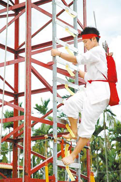 中國臺(tái)灣網(wǎng)5月23日消息 綜合臺(tái)灣媒體報(bào)道,臺(tái)灣屏東縣竹田鄉(xiāng)五王宮與興義堂昨日舉辦晉升神明爬刀梯法會(huì)(“成仙”儀式),11位神明駕前護(hù)衛(wèi)“奉旨”攀登約6層高、72層刀、釘梯。清一色中年男子中,竟出現(xiàn)一位年僅17歲的高二學(xué)生李政賢,以前從未參與廟務(wù)的他,成為全場最受矚目的焦點(diǎn)。