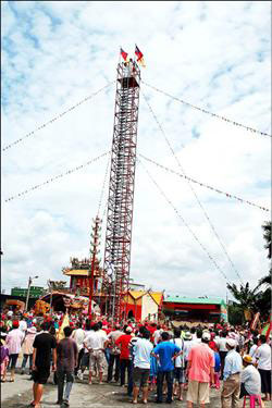 屏東縣竹田鄉(xiāng)五王宮與興義堂昨天舉辦神升晉職儀式,11位神明駕前護(hù)衛(wèi)、乩童及先鋒官,奉旨攀登72層刀、釘梯。圖片來源:臺(tái)灣媒體