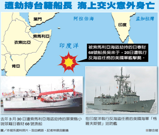 中國臺灣網5月29日消息 據臺灣《聯合報》報道,遭索馬里海盜劫持一年多的臺灣漁船“日春財68號”,今年談判稍有進展,近日卻傳來不幸消息。臺灣外事主管部門昨天(28日)指出,5月20日美國軍艦執行反海盜任務時,遭劫持的“日春財68號”被海盜當作攻擊母船(人質船),與美軍艦交火,臺籍船長吳來于在雙方交火中身亡。