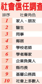 調查中,除了家人朋友外,民眾最信任的社會角色是醫生,其次是同事鄰居、中小學教師、學者專家、企業負責人。最不信任的角色是命理師,其次是名嘴、外勞、民代。最信任的社會團體是消費者保護及環保團體,最不信任的是媒體。
