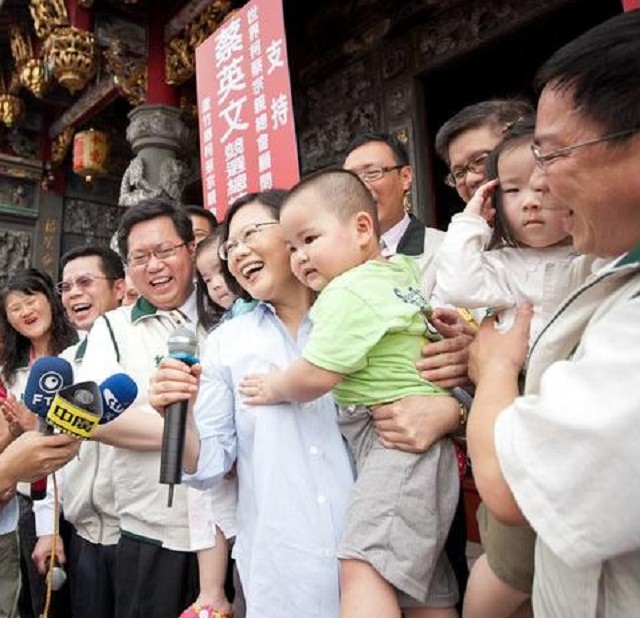民進(jìn)黨主席蔡英文1日下午到桃園五福宮上香,單手抱起胖小孩。圖片來源:臺(tái)灣媒體