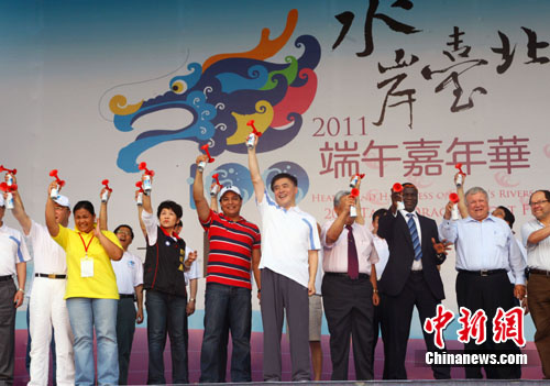6月4日是臺灣今年端午3天連假的首日,各地紛紛舉辦活動,多樣精彩。圖為4日下午,臺北市長郝龍斌等鳴笛為“水岸臺北2011端午嘉年華”揭幕。除165支龍舟隊參與的龍舟賽外,嘉年華還規劃了有美食與游戲的水岸市集嘉年華、合家參與的草地運動場、小朋友參與的夏日樂園,及包粽體驗、接力立蛋祈福等活動。初夏的臺北,民眾樂融融。開幕式上,一對3年前因龍舟賽相識的戀人在眾多民眾見證與祝福中訂下終身。