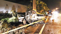 歸途誤踏黃泉路,參加高中學(xué)同學(xué)會(huì)的邱某,6日凌晨聚會(huì)結(jié)束后疑因酒駕撞上路邊電線桿,當(dāng)場(chǎng)被燒死在變形車體內(nèi)。圖片來源:網(wǎng)絡(luò)