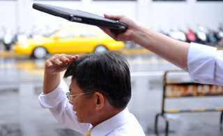 前高雄縣長楊秋興離開臺灣“高等法院”時遇上午后雷陣雨,幕僚用平板計算機為他遮雨,形成有趣景象。圖片來源:臺灣“今日新聞網”