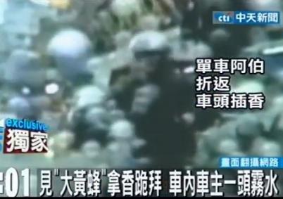 臺灣一老伯當街插香跪拜跑車。圖片來源:臺灣中天電視臺