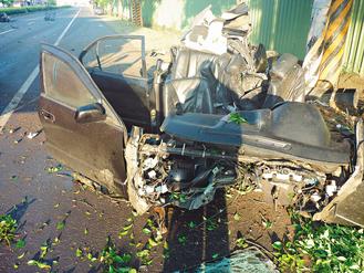 云林縣林內(nèi)鄉(xiāng)外環(huán)道9日清晨發(fā)生自撞路樹四死重大車禍,肇事轎車扭曲變形全毀。圖片來源:臺灣《聯(lián)合報》