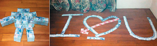 詐騙集團成員在無名網站部落格,秀出用700多萬元現金排成的人形與“我愛你”圖案。(圖片來源:臺灣《聯合報》)