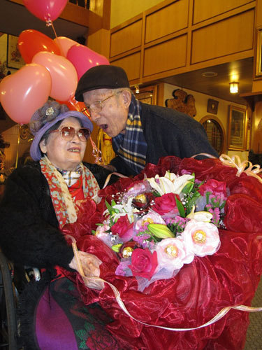 嘉義市90歲老翁蔡戊田(右)、與87歲的妻子黃華月(左)結婚64年,于13日情人節前夕再度約會,蔡戊田出其不意,獻上超大的情人花束,讓黃華月感動又開心。 圖片來源:臺灣“中央社”