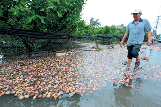 豪大雨造成屏東林邊淹水不退,當(dāng)?shù)厣忟F落果嚴(yán)重,農(nóng)民欲哭無(wú)淚,擔(dān)心連蓮霧樹株也將不保。圖片來(lái)源:臺(tái)灣《聯(lián)合報(bào)》