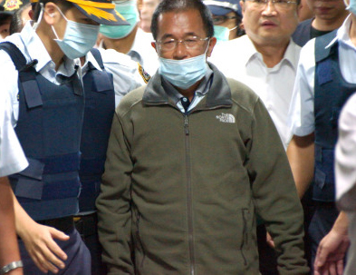 陳水扁(中)11日早著外套、內穿防彈背心,由臺北監獄及警力團團戒護,到桃園醫院檢查。陳水扁臉色微泛暗沉、未發一語。(圖片來自臺媒)