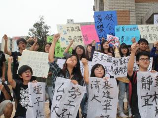 “反對調漲、逐年調降”,臺當局“教育部”的“大專學雜費調整方案(草案)”首場公聽會下午在臺中市舉行,但包括臺大、政大、東海、靜宜、亞洲、朝陽等大學的學生社團動員數10名學生舉著標語、高喊口號,從會場外一直抗議到會場內。