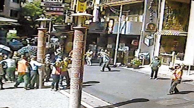 【游客抱柱】地震時,南投日月潭許多游客從屋里跑出,有人嚇得緊抱路邊柱子。(圖片來自臺媒)