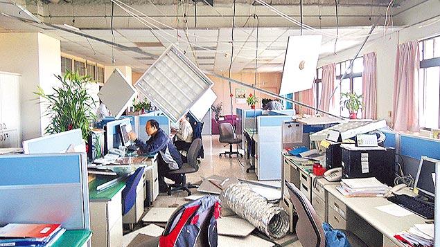 【凌亂不堪】臺中市政府陽明大樓五樓辦公室,在地震劇烈搖晃下,天花板掉落一大片。(圖片來自臺媒)