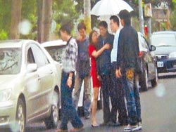 陳俊雄被拍到接受廠商招待,不但有業者為他撐傘遮雨,還有身穿紅衣的酒店女陪侍雙手環抱。(來源:臺灣《中國時報》)