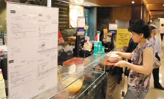 臺北市府衛生局昨天首波針對有販賣與供應粄條、肉圓等八大類產品的餐飲業,輔導業者在明顯處張貼安全證明,讓消費者安心。圖片來源:臺灣《聯合報》