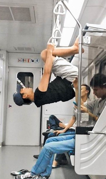臺灣火車一外國勞工上演“拉環體操”,讓同車乘客嚇了一跳。(圖片來自臺媒)