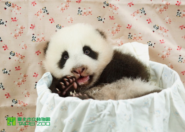 剛出生時的“圓仔”是個小肉球,眼睛尚未睜開,只看得到眼睛部位有一條細小的縫。一般而言大熊貓寶寶要在出生約45天前后才會睜開眼睛,而“圓仔”則在出生第42天時就睜開了雙眼。直到現在出生第73天了,醒著的時候“圓仔”常常睜著雙眼東張西望,眼睛越來越亮,雖然視線對焦還是不太好,但好像開始對會在眼前晃動的事物有些反應了,相信很快的“圓仔”就會跟爸爸媽媽一樣睜著雪亮的大眼睛盯著人看。(中國臺灣網 周劍)