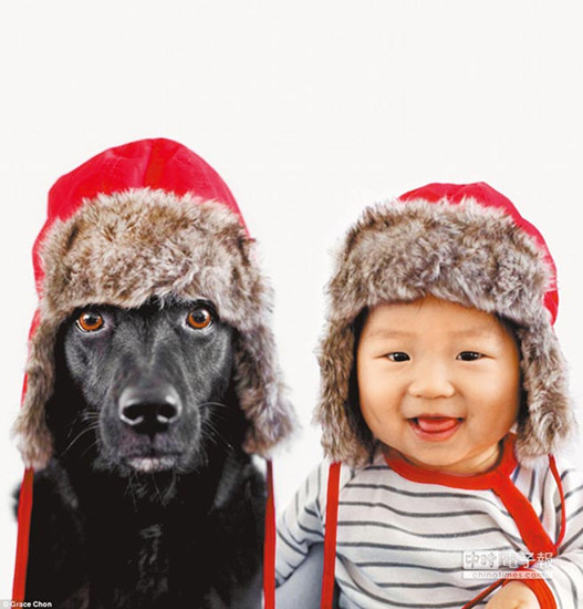 據臺灣《中國時報》報道,臺灣流浪狗柔伊(Zoey)萌照躍上國際媒體。美國女攝影師葛瑞斯7年前認養柔伊,日前將它與10個月大的兒子杰士伯打扮相同造型一起入鏡,真像是“人狗雙胞胎”。