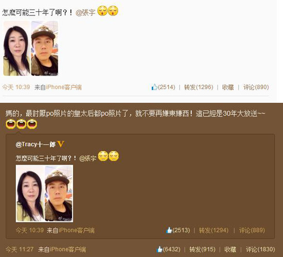 5日是兩人戀愛30年的紀念日,蕭十一郎在微博分享了二人的“合照”,相似表情和角度很逗趣。她說:“怎么可能三十年了啊?!”張宇隨后也轉發(fā)妻子的微博,驚訝的說,“最討厭po照片的皇太后(指蕭十一郎)都po照片了,就不要再嫌東嫌西!這已經是30年大放送”,稱老婆為“皇太后”。盡管網友笑稱是“妻管嚴”,但也在微博發(fā)起“有一種愛情叫張宇十一郎”話題,紛紛表示祝福。(中國臺灣網 何建峰)