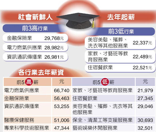 若以行業別來看,最有行情的社會新鮮人,首推金融保險業,平均起薪29768元,電力及燃氣供應業居次,28982元,服務業的起薪相對則較低,僅22K、23K。