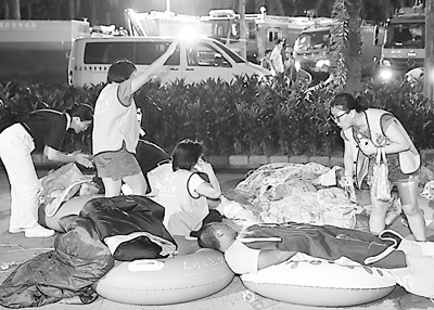 在新北市八仙水上樂園,醫護人員對受傷游客進行簡單醫治。