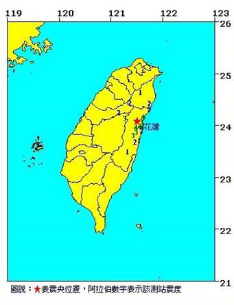 根據(jù)臺灣氣象部門報告,震央位于花蓮縣政府西北14.3公里處,地震深度23.8公里。(中國臺灣網(wǎng) 李寧)