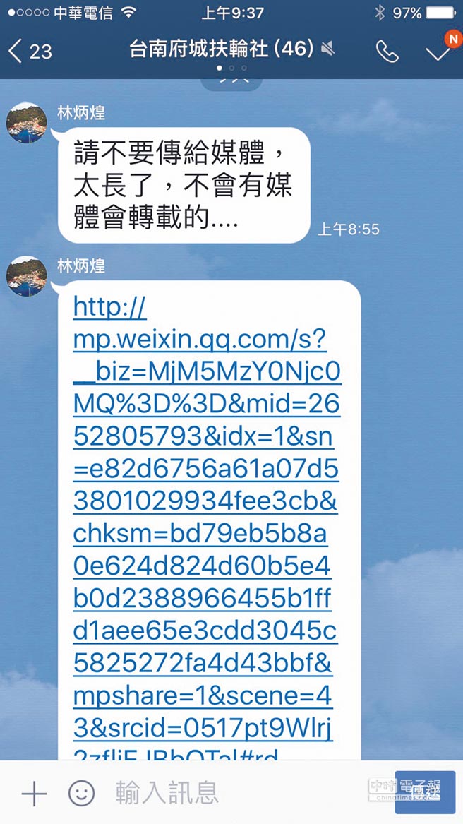 林炳煌在社交媒體發出一篇他人撰寫的評論短文。(圖片來源:臺灣“中時電子報”)