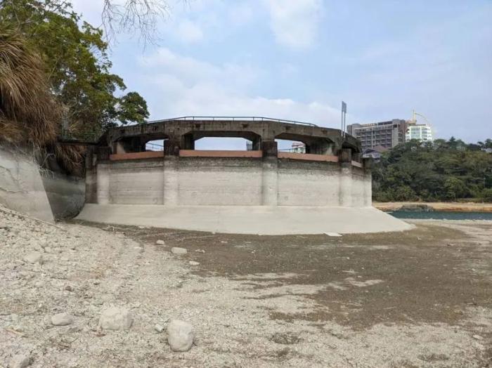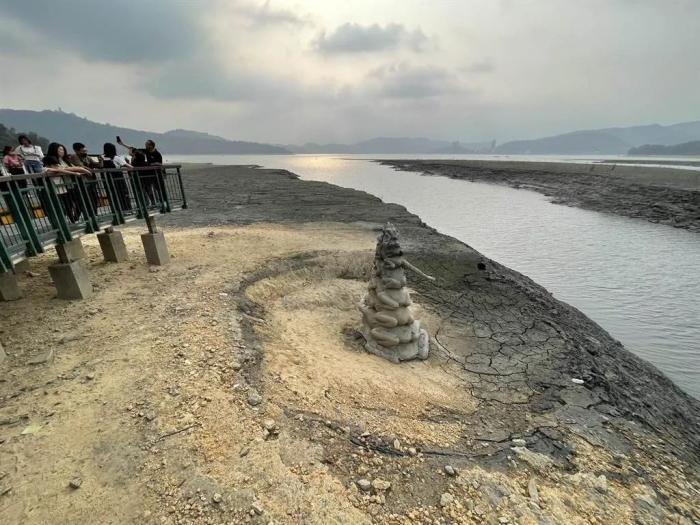 如今,這片位于臺灣中部的美麗湖泊,卻正遭遇干旱危機。久旱不雨加之配合彰化、云林春季的農(nóng)業(yè)灌溉用水,導致日月潭水位持續(xù)下降,蓄水率僅為60.5%。潭區(qū)中用以觀察蓄水量和水情的“九蛙疊像”已全部浮出水面,令到訪游客驚呼,“九只都出現(xiàn)了,好夸張喔!”;“神秘黑洞”溢流井建筑本體也已露出,成為“旱象奇觀”。